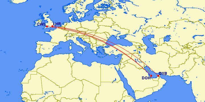 That’s not the only option. Similarly you can fly from Abu Dhabi to London to Amman to Dubai to Cardiff.