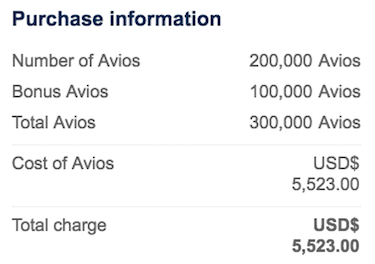 In the case of my account (which is registered in the US), I’m given the option of purchasing up to 300,000 Avios for $5,523, which is a cost of 1.84 cents per Avios.