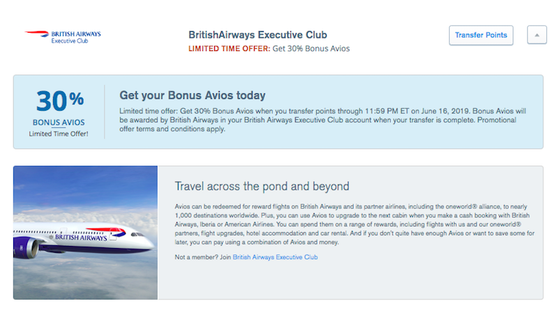 Through June 16, 2019, you can even get a 30% bonus when you transfer Chase Ultimate Rewards points to British Airways Executive Club.