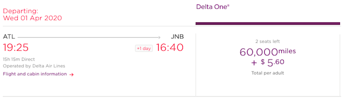 In the rare circumstance that you can find award space on Delta’s ultra long haul flight from Atlanta to Johannesburg (there are often two seats available right as the schedule opens), that is also bookable for just 60,000 miles one-way in business class, which is spectacular.