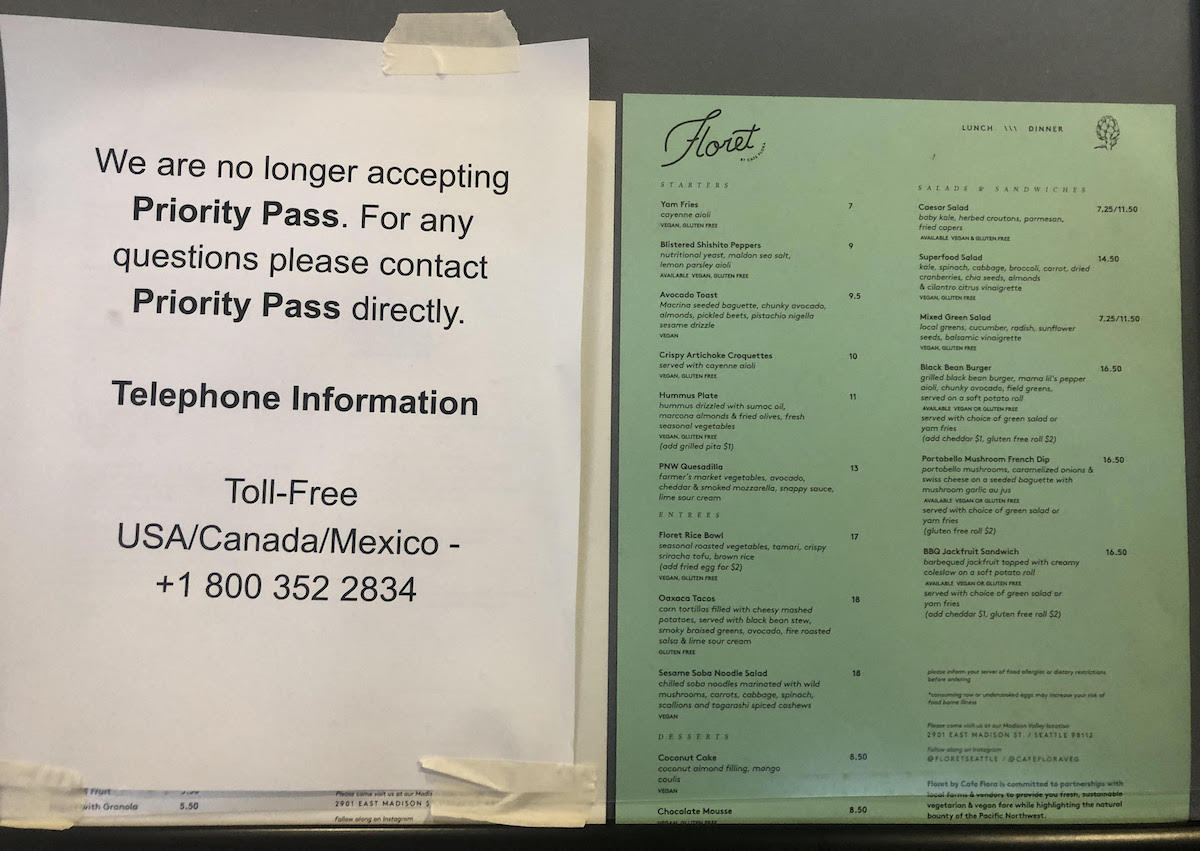 Unfortunately there’s bad news on this front now. Floret by Cafe Flora has now been removed from Priority Pass altogether. While the restaurant still shows up on Priority Pass’ website as of now, the following sign can be found in front of the restaurant (thanks to reader Greg for sharing this).