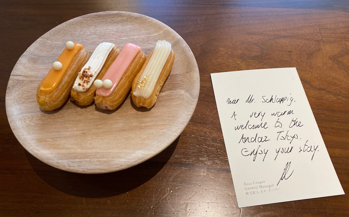 Waiting on one of the tables was a welcome amenity consisting of some eclairs.