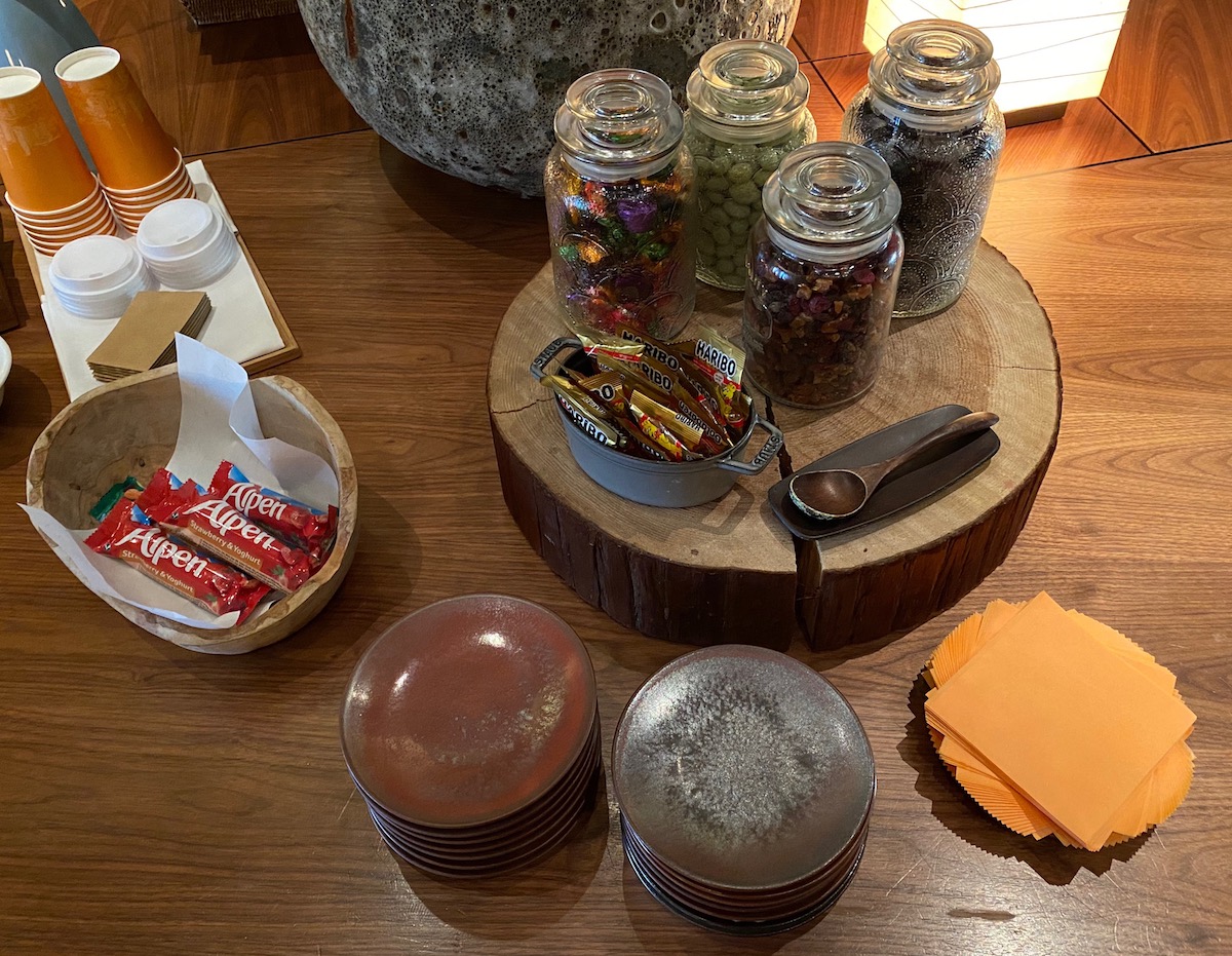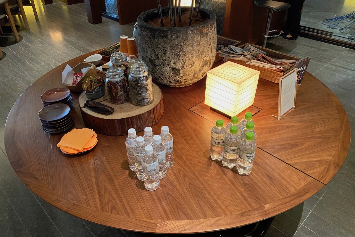 While waiting I walked around the lobby a bit. Andaz offers all-day complimentary coffee, tea, soft drinks, water, and snacks. There was an espresso machine, which was a nice touch, since it made it easy to get a coffee when I woke up at 3AM.
