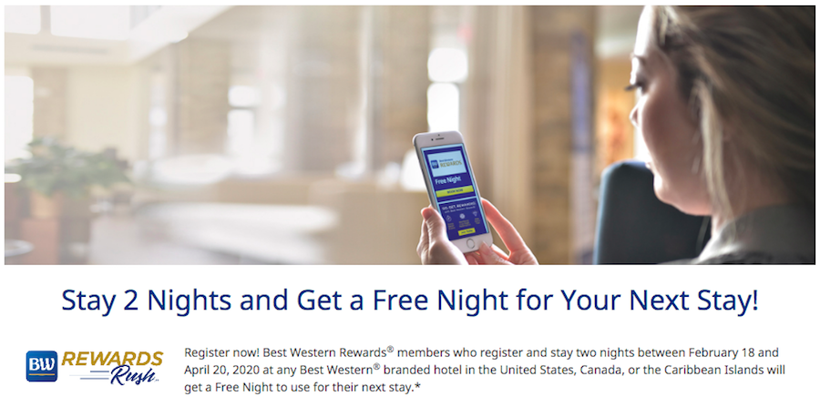 Best Western Rewards is offering a free night when you stay two nights between February 18 and April 20, 2020, at any Best Western branded hotel in the United States, Canada, or the Caribbean.