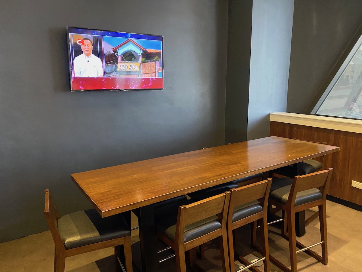 Near the entrance was a communal table right by a TV, where I ended up sitting.