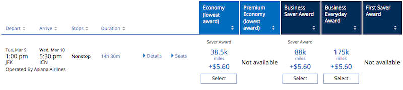 The below New York to Seoul Incheon business class ticket on Asiana used to cost 80,000 miles one-way, but the price has gone up by 10%, to 88,000 miles.