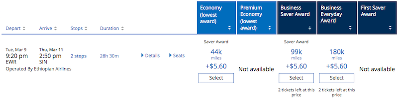 The below New York to Singapore business class ticket on Ethiopian used to cost 90,000 miles one-way, but the price has gone up by 10%, to 99,000 miles.